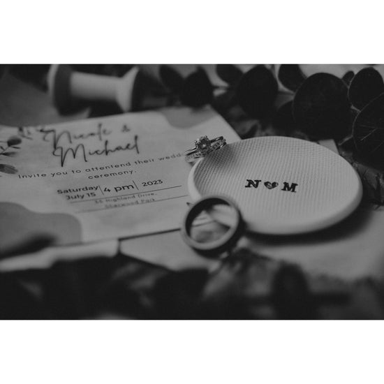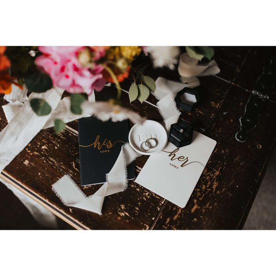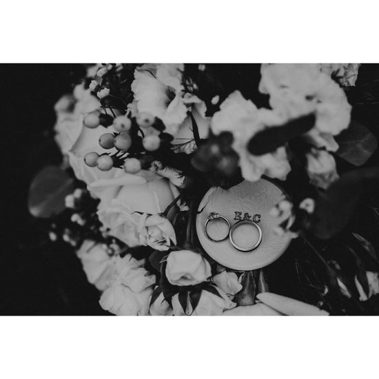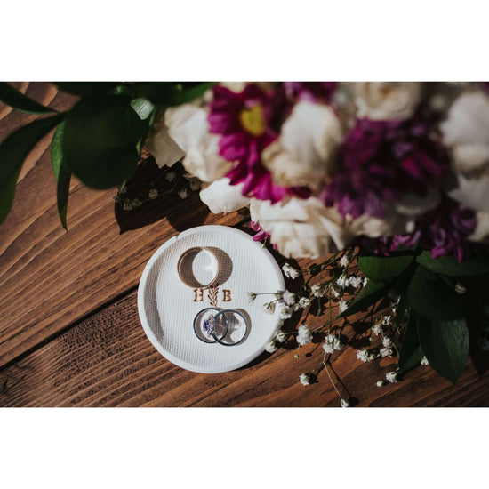 N & M's classic wedding featuring our textured initial ring dish personalized in black