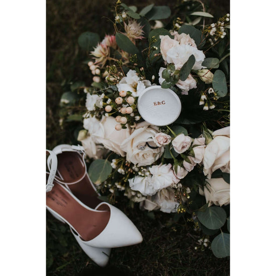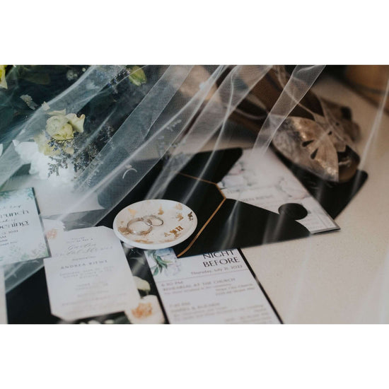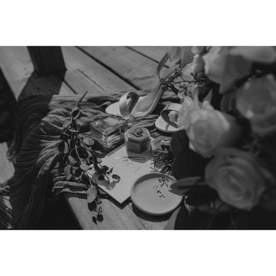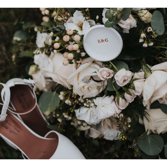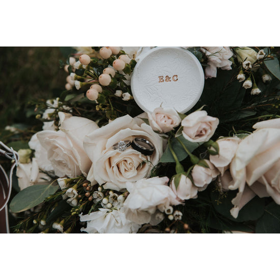 T & J's beautiful day-of-shoot featuring our floral ring dish