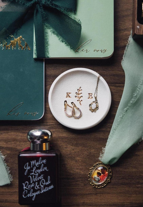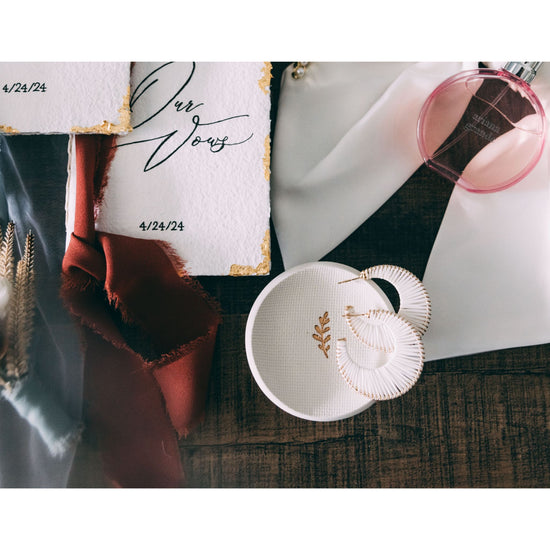 Our textured leaf ring dish featured in a day-of-wedding flatlay