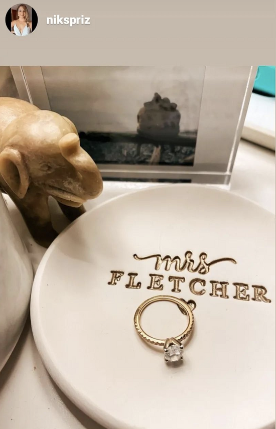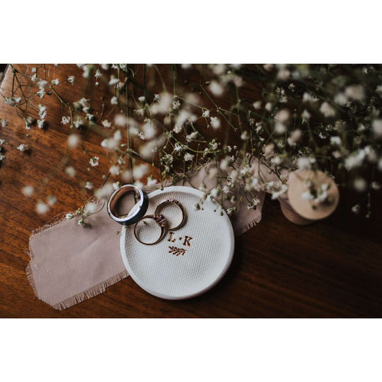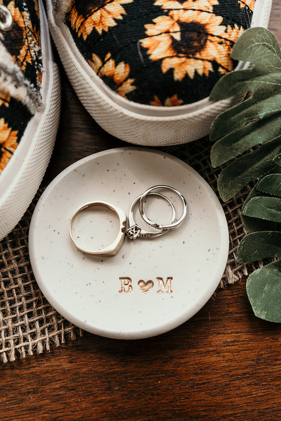 Custom ring dish featuring initials and date to commemorate the couple's engagement