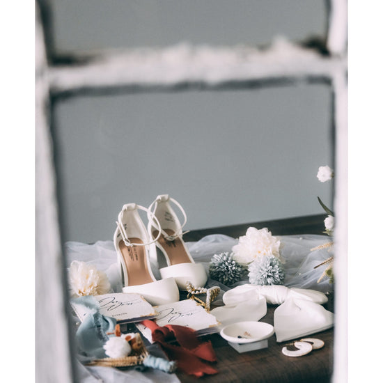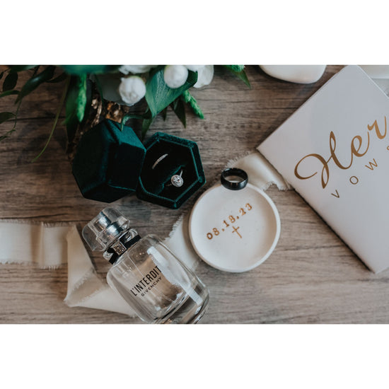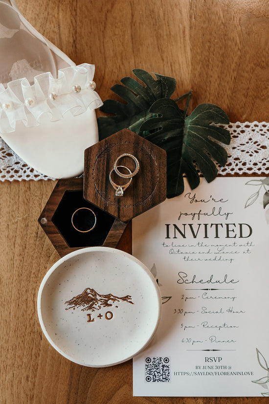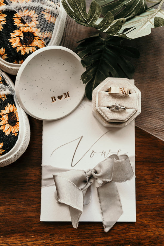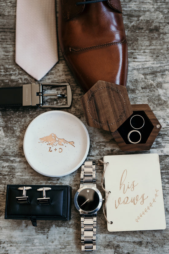 Our mountain ring dish featured in a day-of-wedding detail shot from L & O's special day